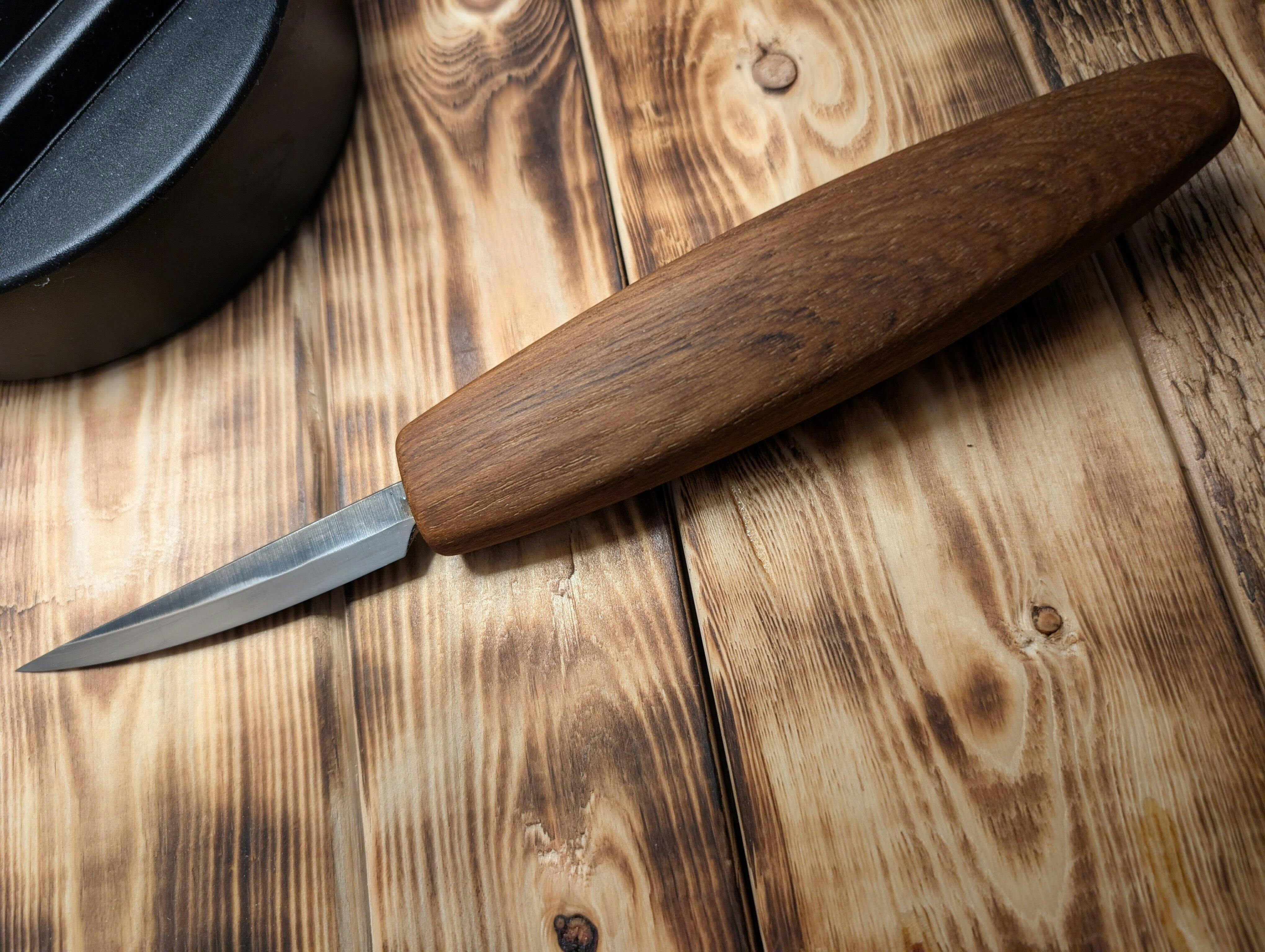 This is your all around carving Sloyd knife. Skinnier than our Bushcraft blade and made to take those tight curves on a spoon or kuksa. Made from W1 round stock tool steel. It holds an edge well with just stropping. 3 blade lengths in a straight or upswept profile, and 3 different wood options for your handle - or just the blade. Leather sheath sold separately.